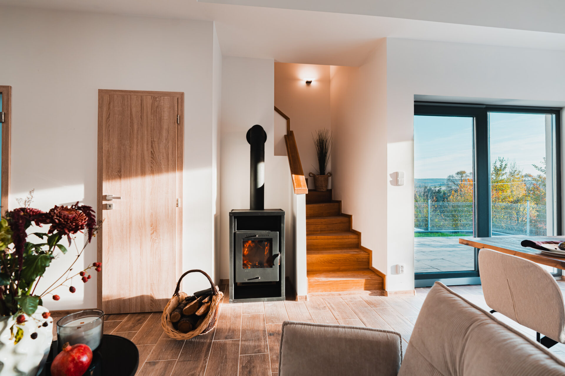 Podlahové topení, tepelné čerpadlo, krbová kamna.
