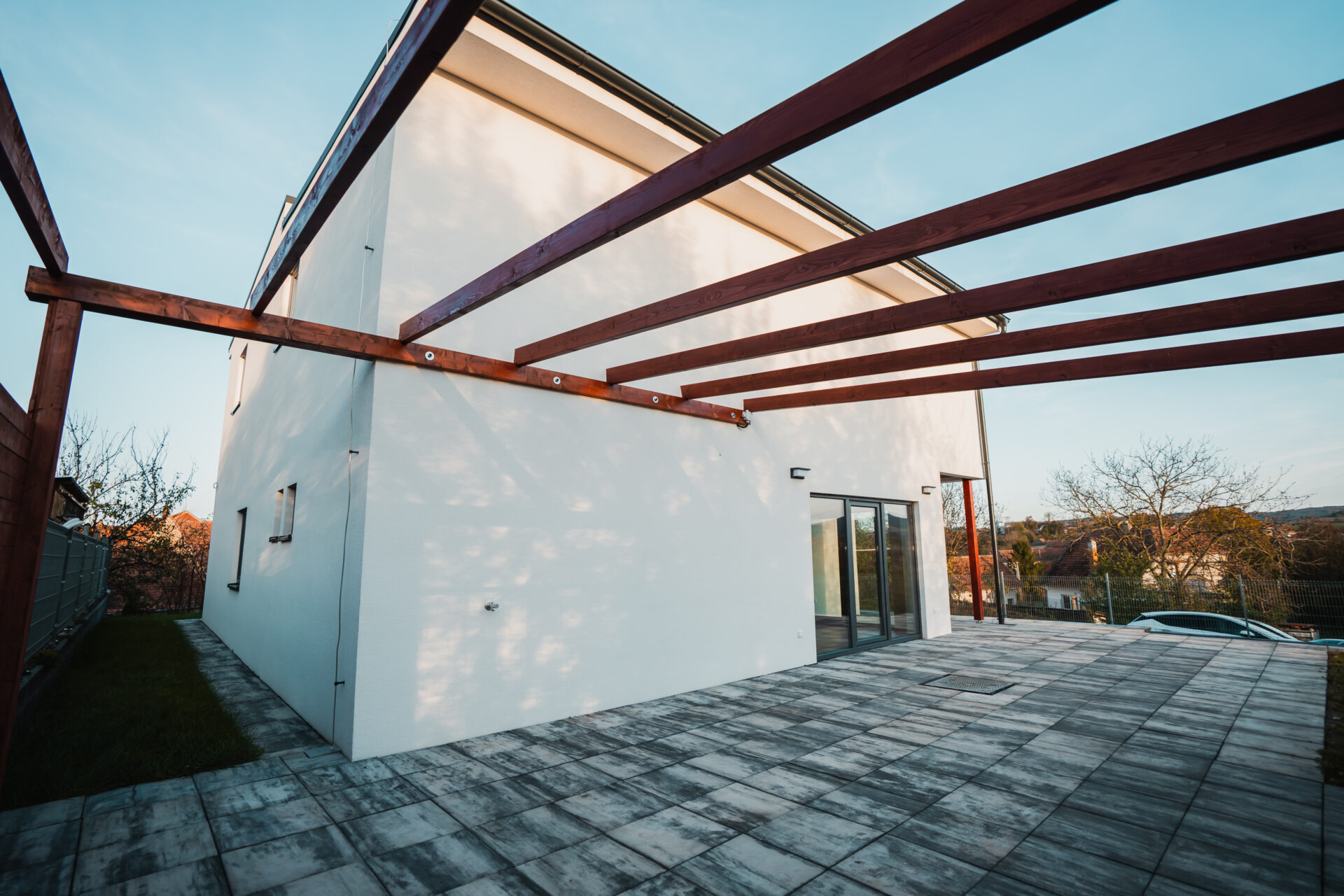 A terasa? Ta si říká o snídani v pyžamu a víno při západu slunce. Pod pergolou jsou dvě parkovací místa.